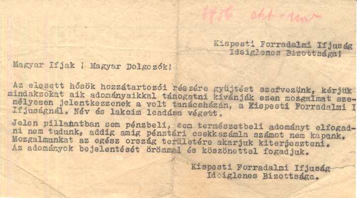 1956-os röplap: Magyar Ifjak! Magyar Dolgozók! a Kispesti Forradalmi Ifjúság Ideiglenes Bizottsága röplapja