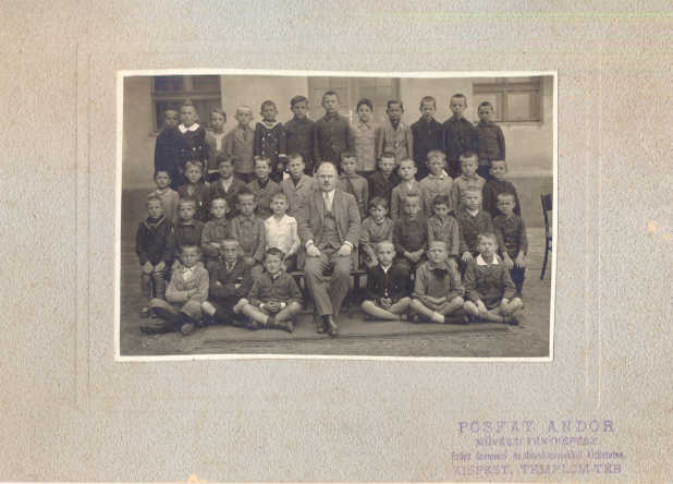 Régi, kartonra ragasztott iskolai csoportkép, fiú tagozat. Posfay Andor kispesti műterméből.
