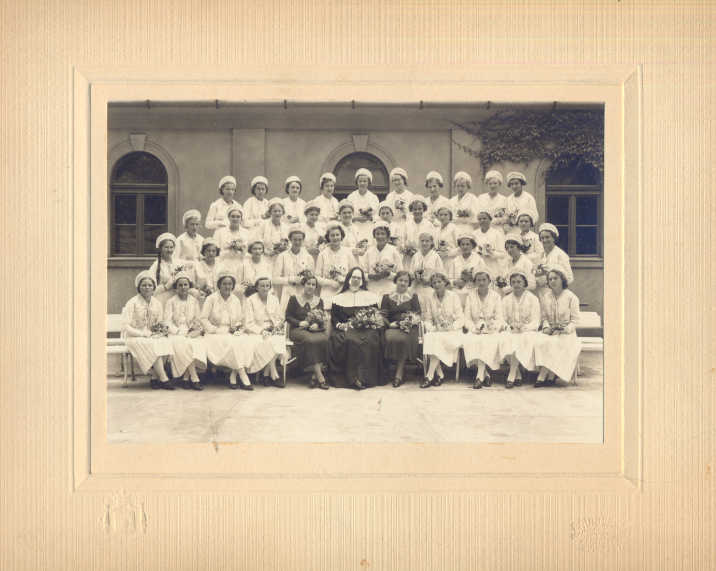 Régi, kartonra ragasztott iskolai csoportkép, lány tagozat. Fotós: Brünhuber udv. és kam. fényképész.