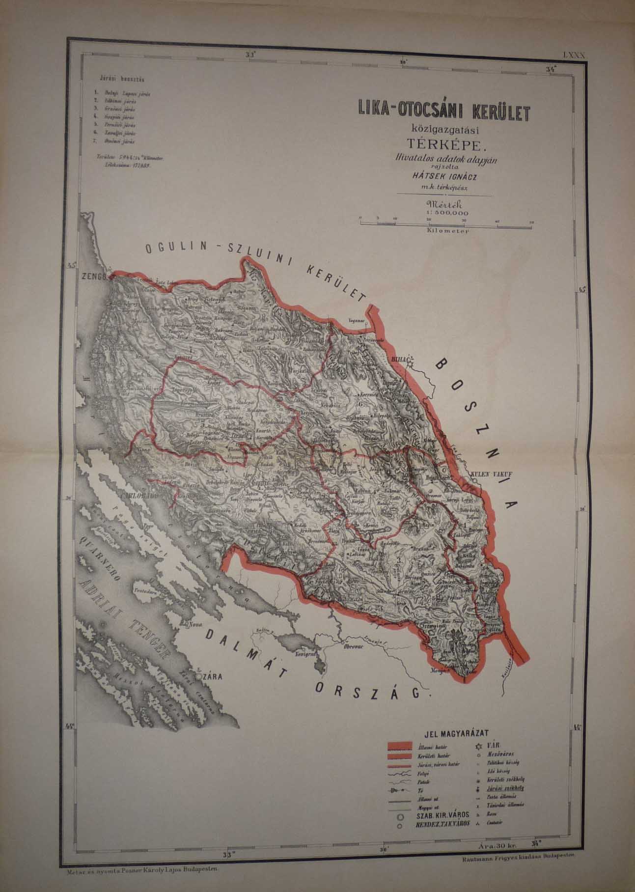 térkép: Lika-Otocsáni kerület közigazgatási térképe / hivatalos adatok alapján 1 térkl. kőnyomat, színes ; 38x54 cm